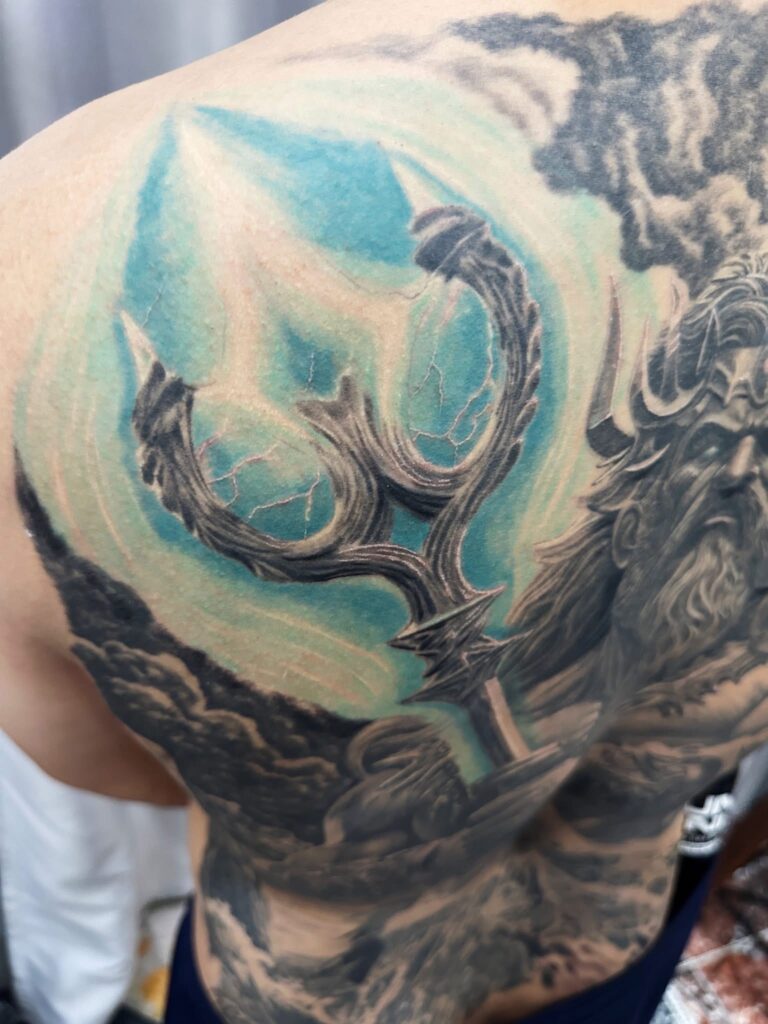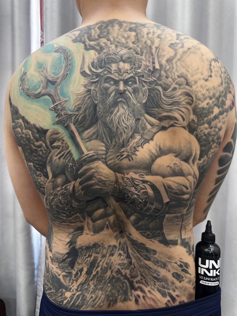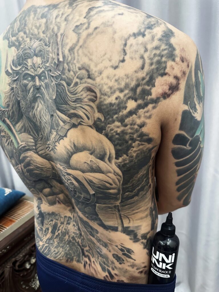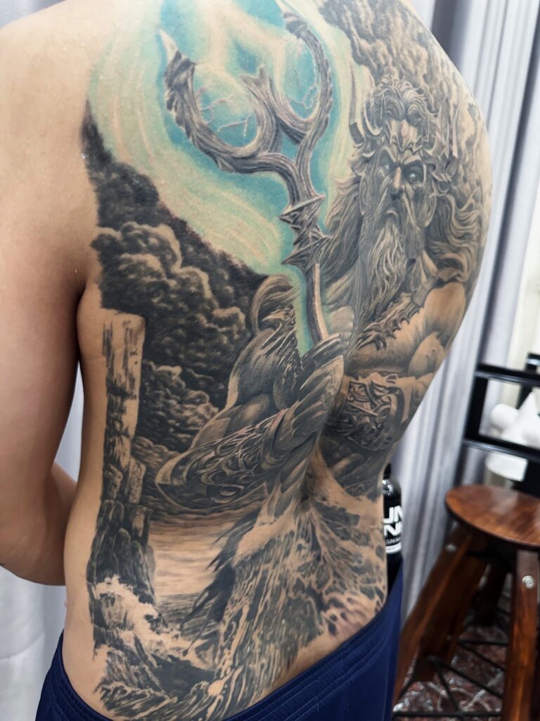 1 hình xăm của khách hàng mang mệnh thuỷ, vừa muốn có 1 dấu ấn nghệ thuật trên cơ thể lại vừa mang tính tượng trưng cho bản ngã của mình Biển có lúc tĩnh lặng, lúc nổi bão. Poseidon tượng trưng cho việc làm chủ cảm xúc, vượt sóng vượt gió.