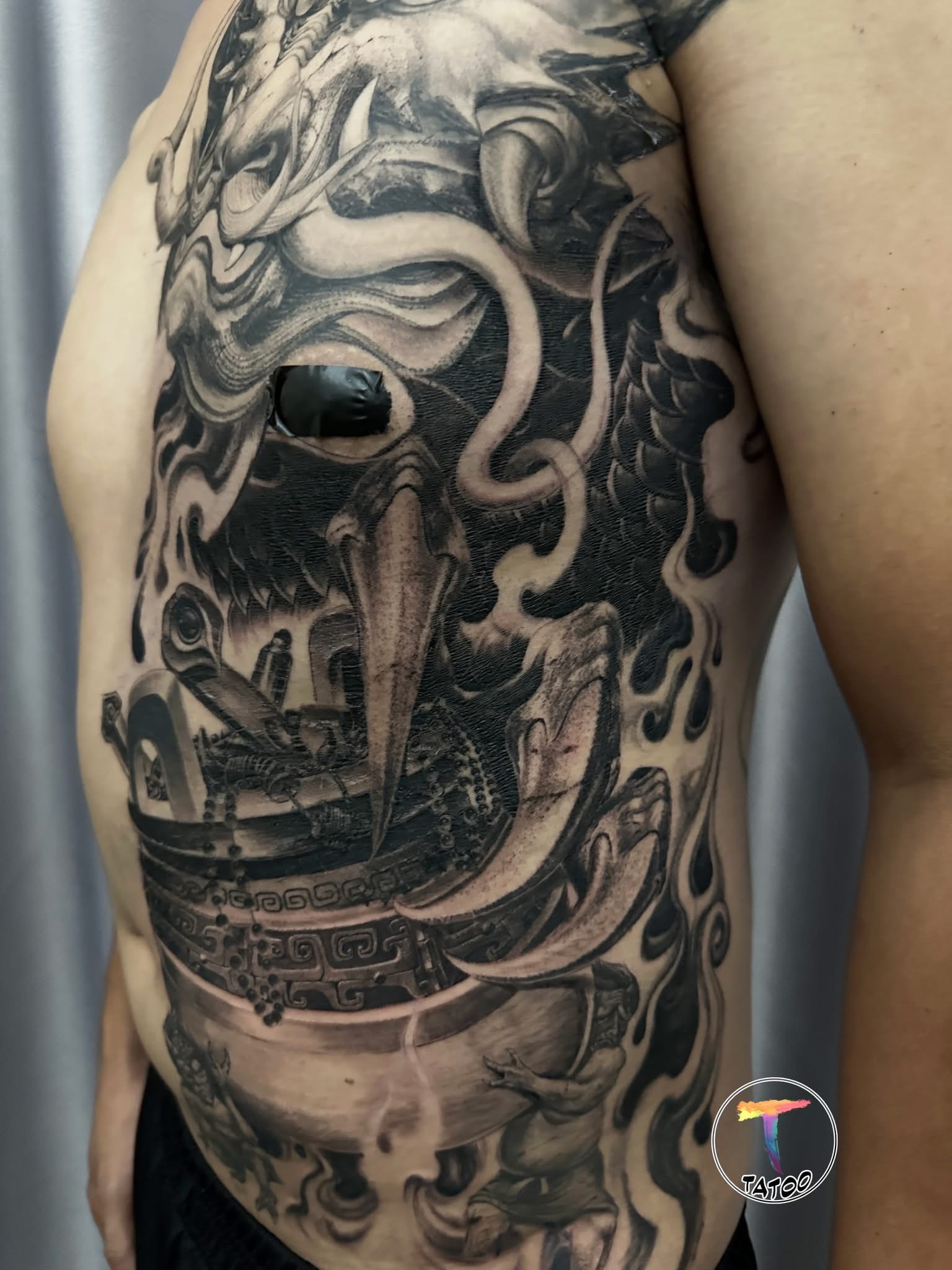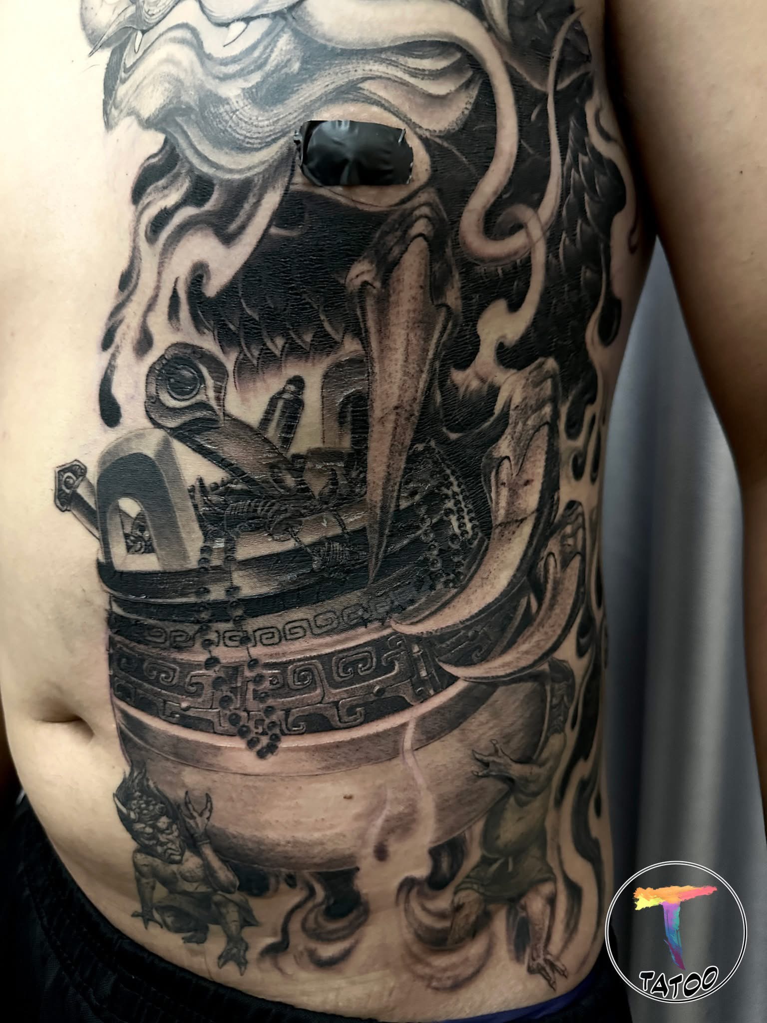 1 hình xăm được khách tin tưởng và freehand với ý nghĩa muốn đem lại tài lộc và thịnh vượng mãi mãi . Kết hợp với 2 chú quỷ độc đáo dưới đáy chum ví như những thứ ngoại lực làm tiêu hao đi tiền tài , nhưng không qua mắt nổi chủ nhân của bức hình.